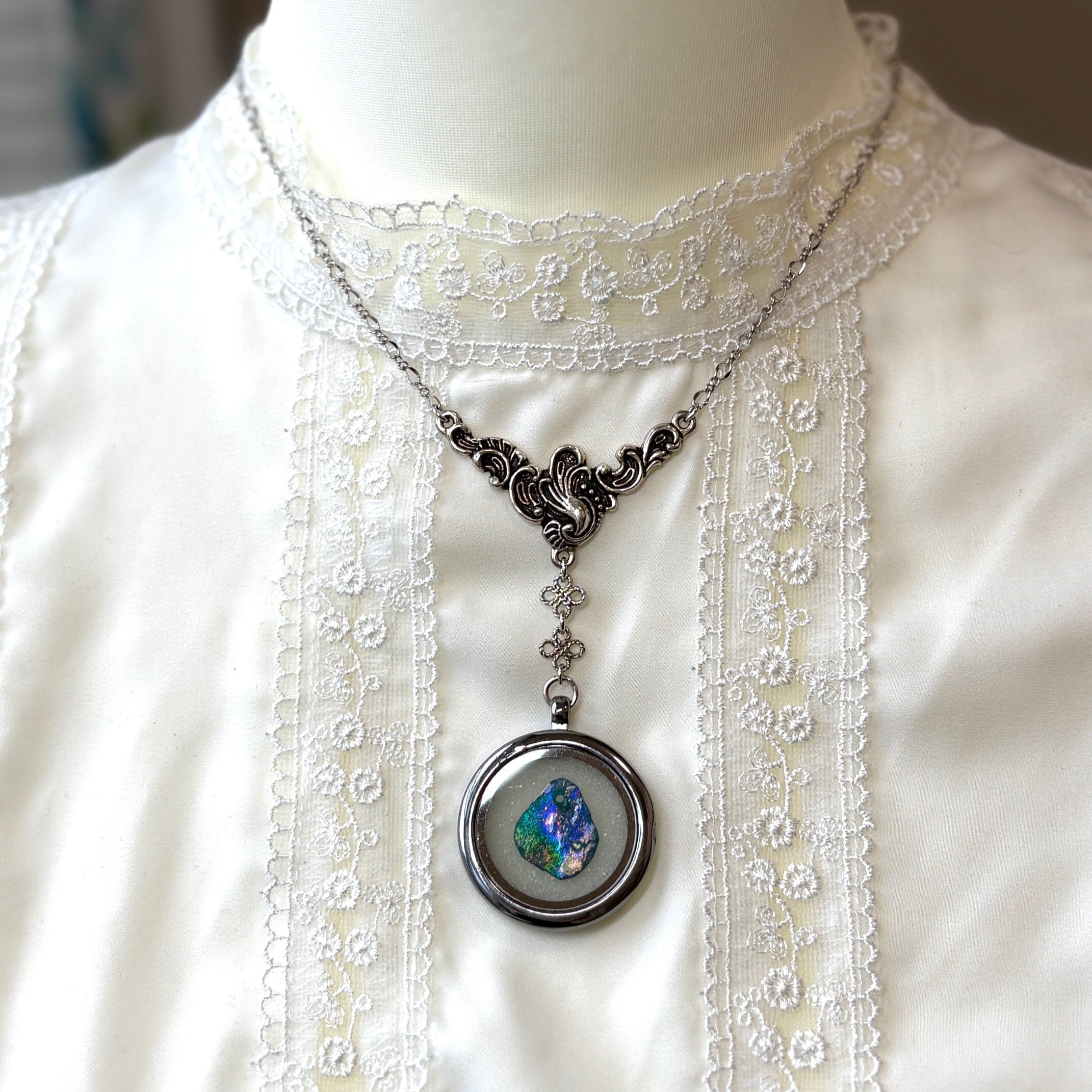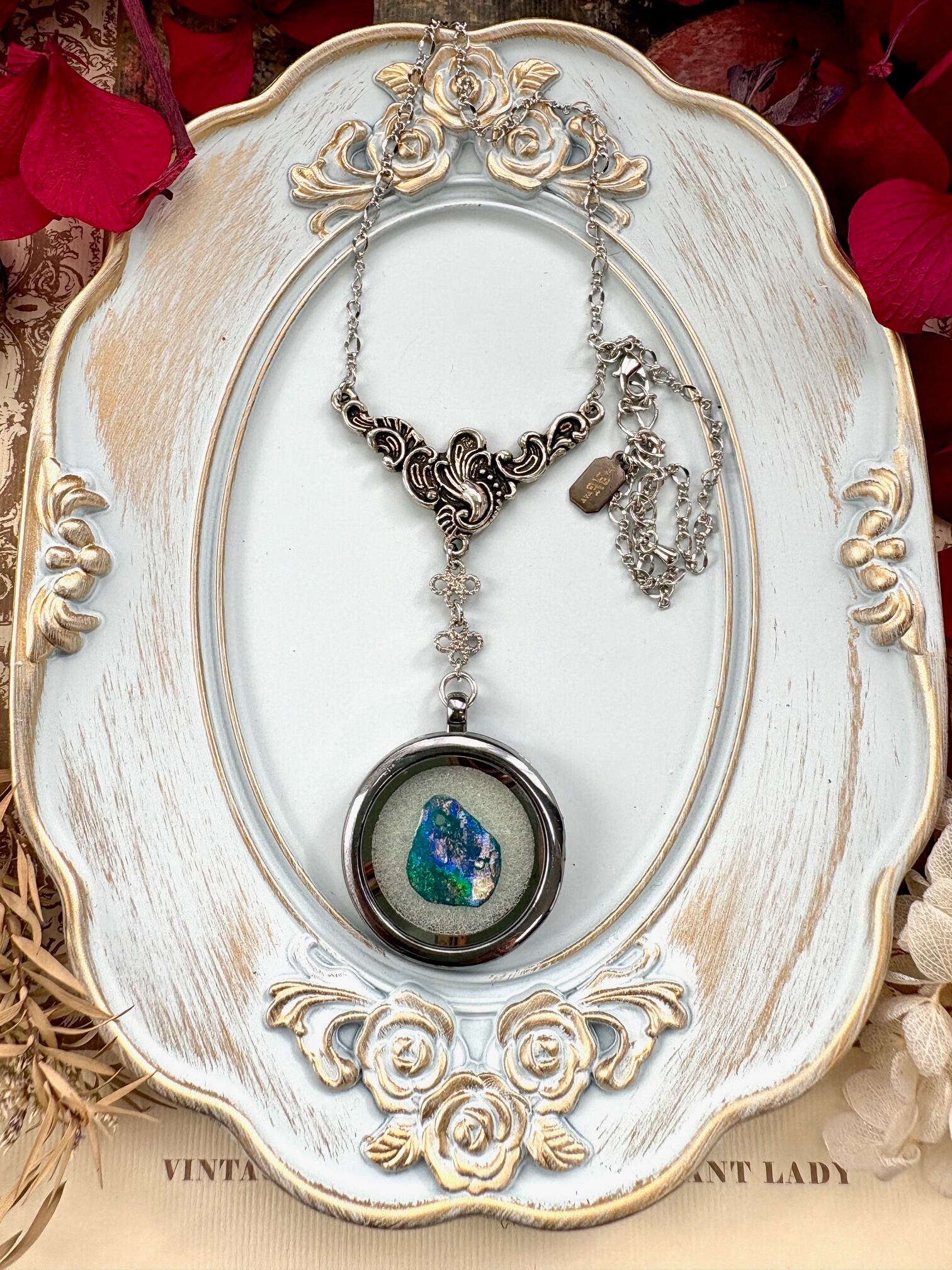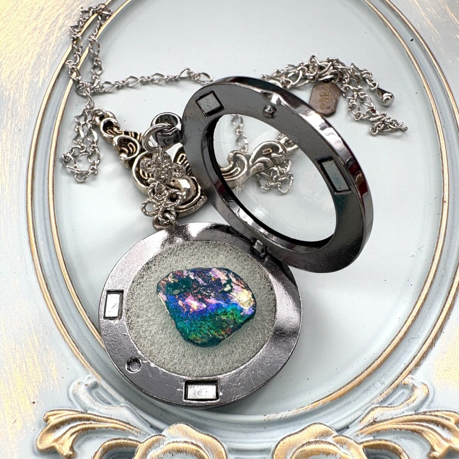 ローマングラス ローマガラス ローマ ガラス 標本 ネックレス アンティーク ヴィンテージ コスチュームジュエリー 七色 青 緑 赤 プレゼント レア シルバー ロケット ペンダント 普段 コレクター 虹 レインボー 銀化 古い アンティークジュエリー パーツ 神秘的 銀 ロケット アクセサリー 鉱物 ギフト 一点物 宝石 ジュエリー 博物 石 個性的