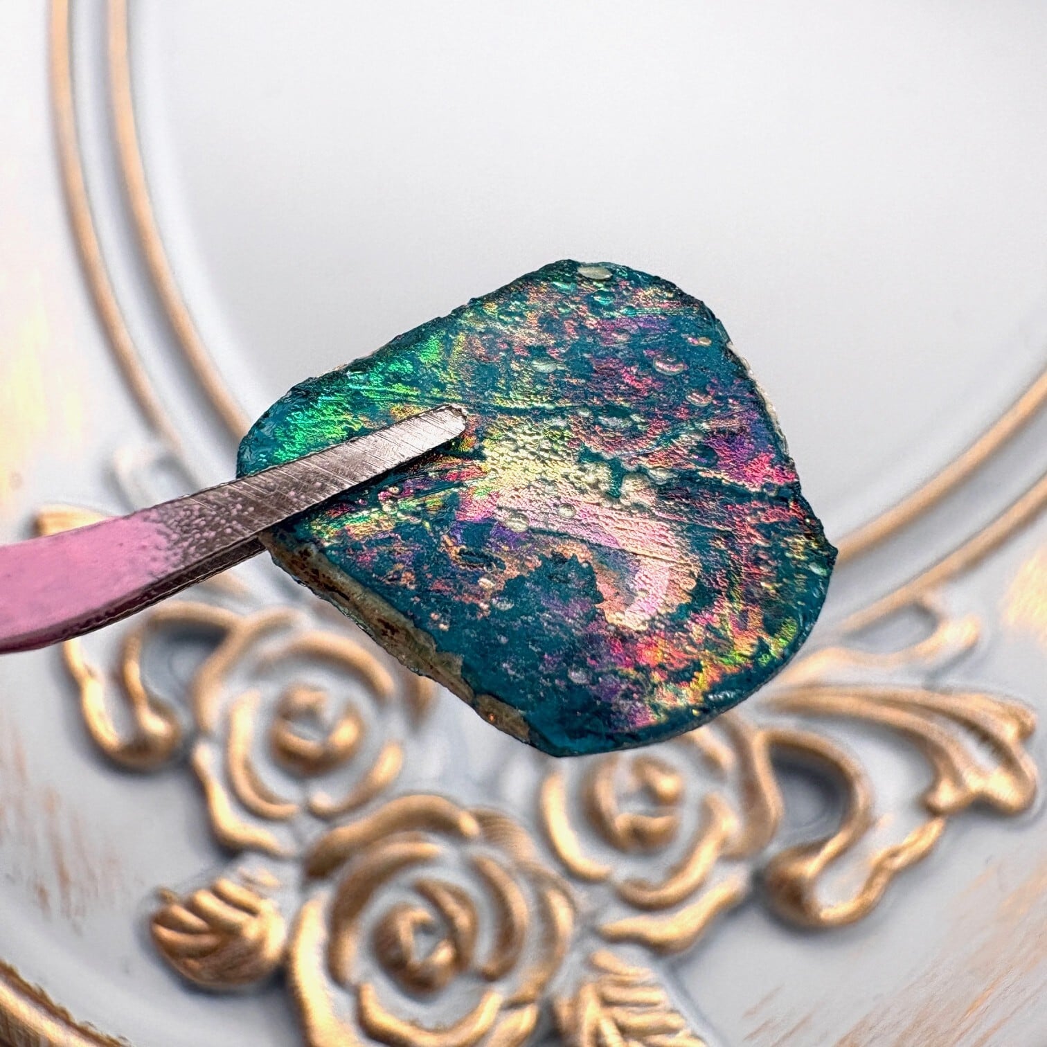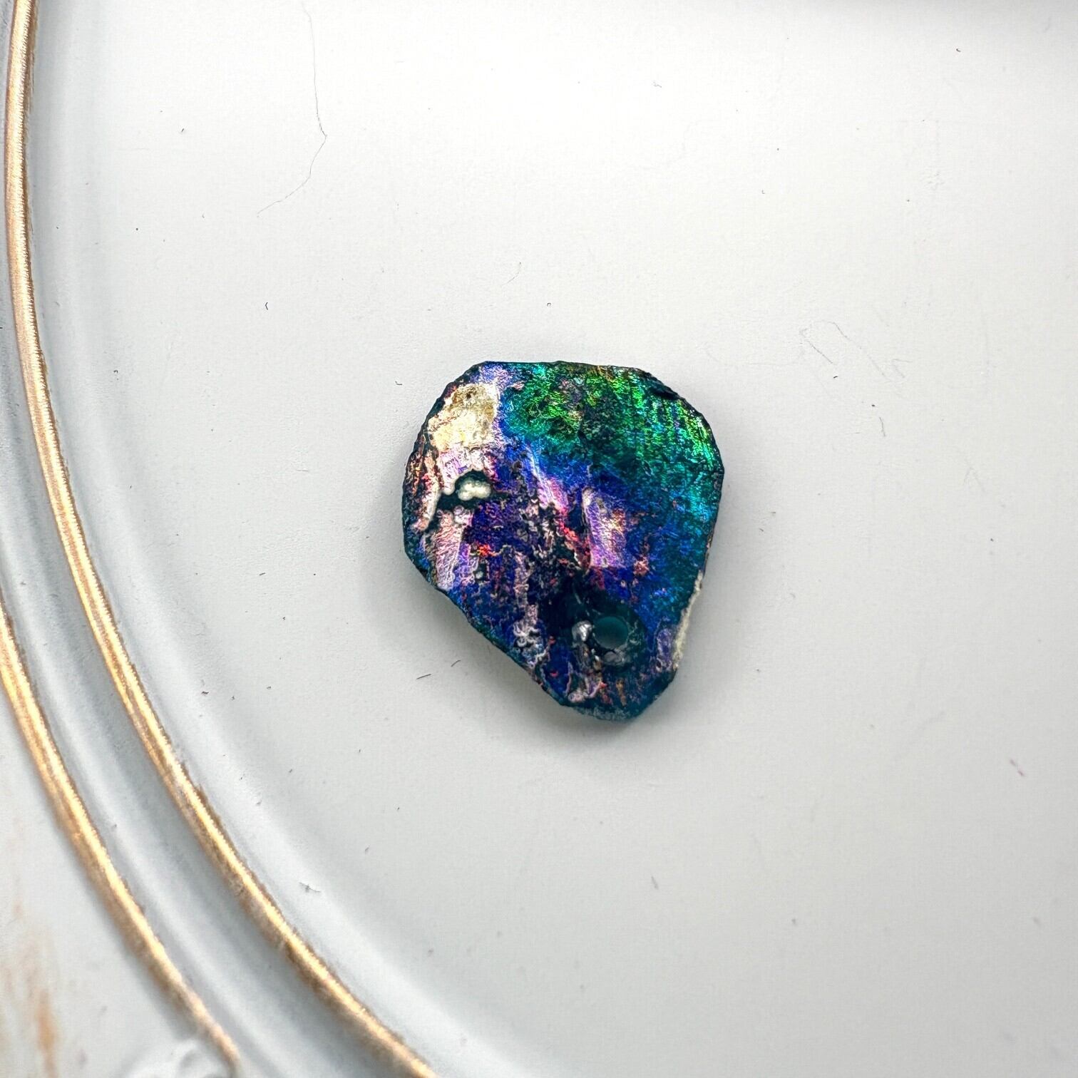 表と裏、光の当たり具合によって色味が異なるので、虹の様な輝きを存分に楽しむ事が出来る一品です。
