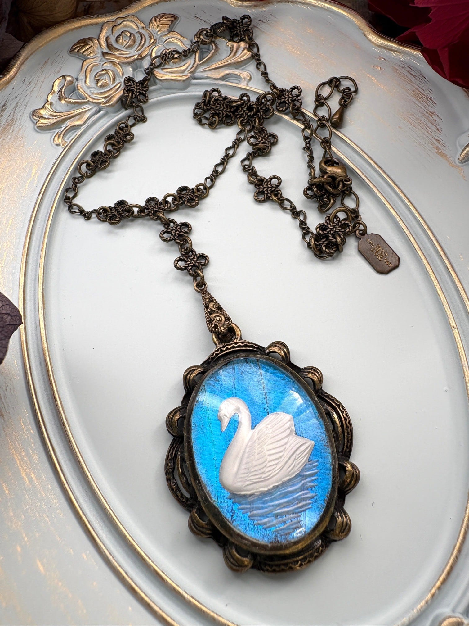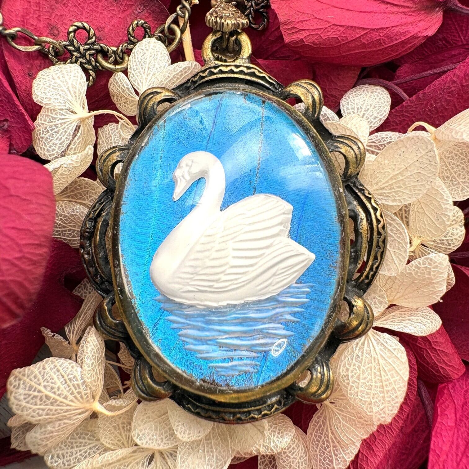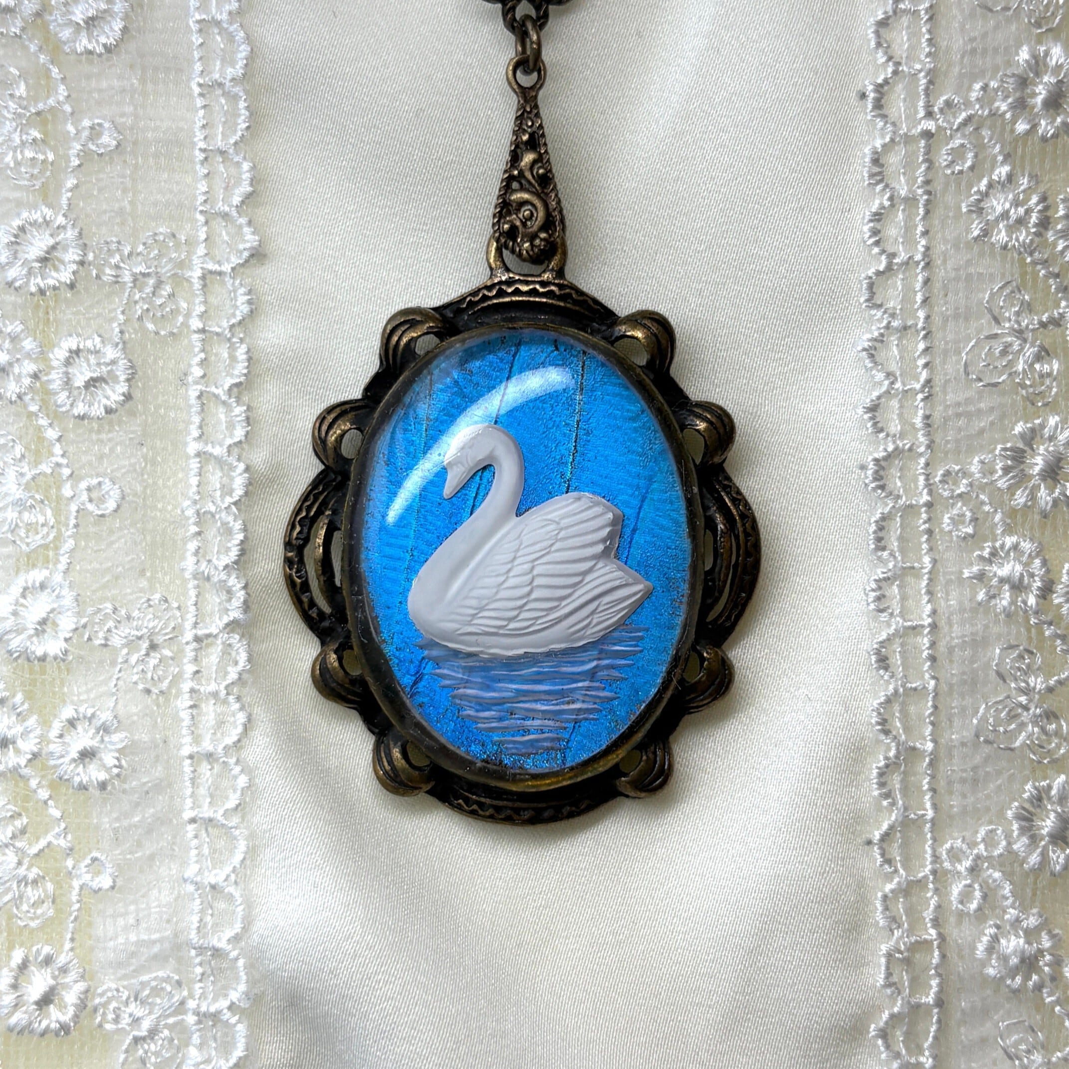 ゴダルティモルフォ蝶翅の白鳥インタリオネックレス
