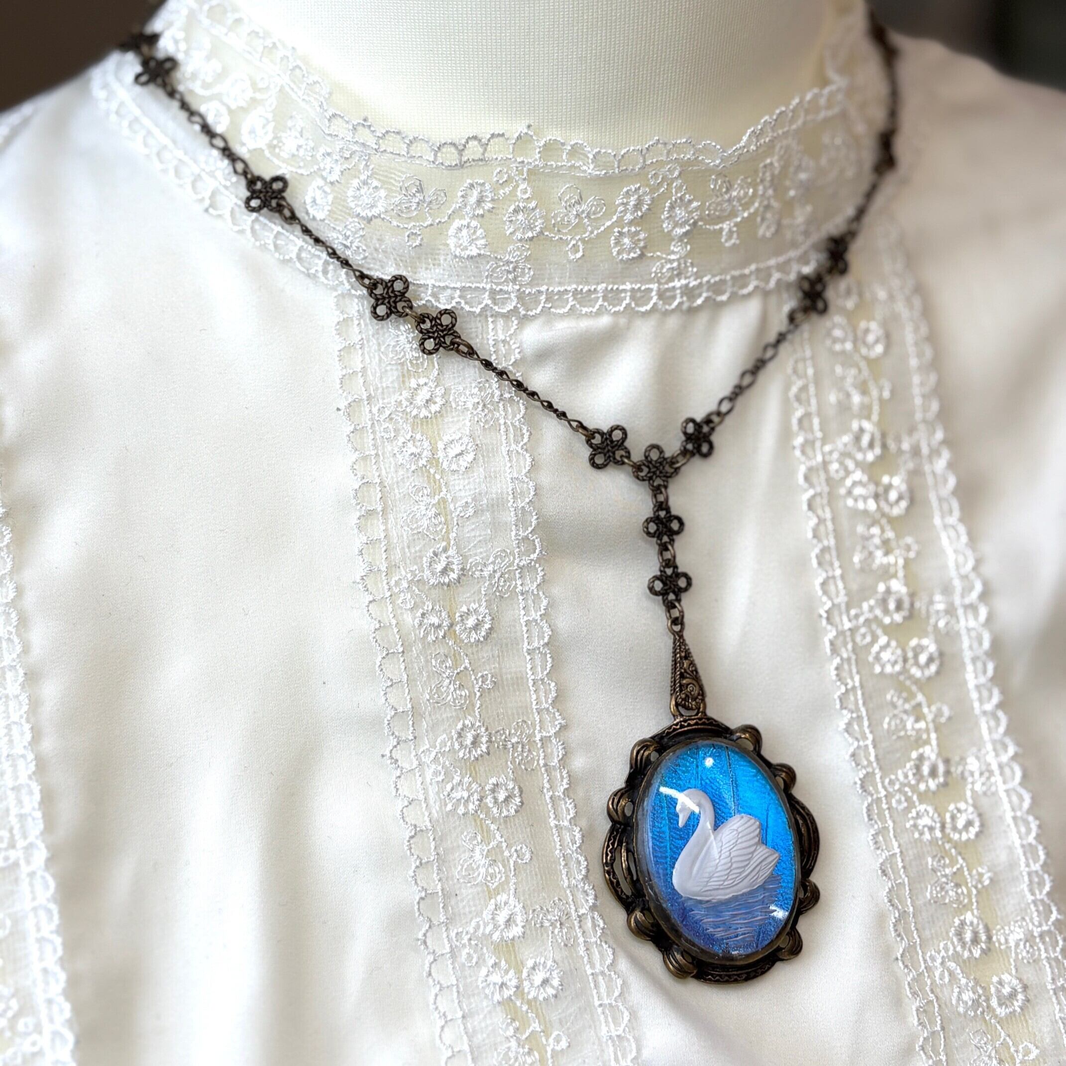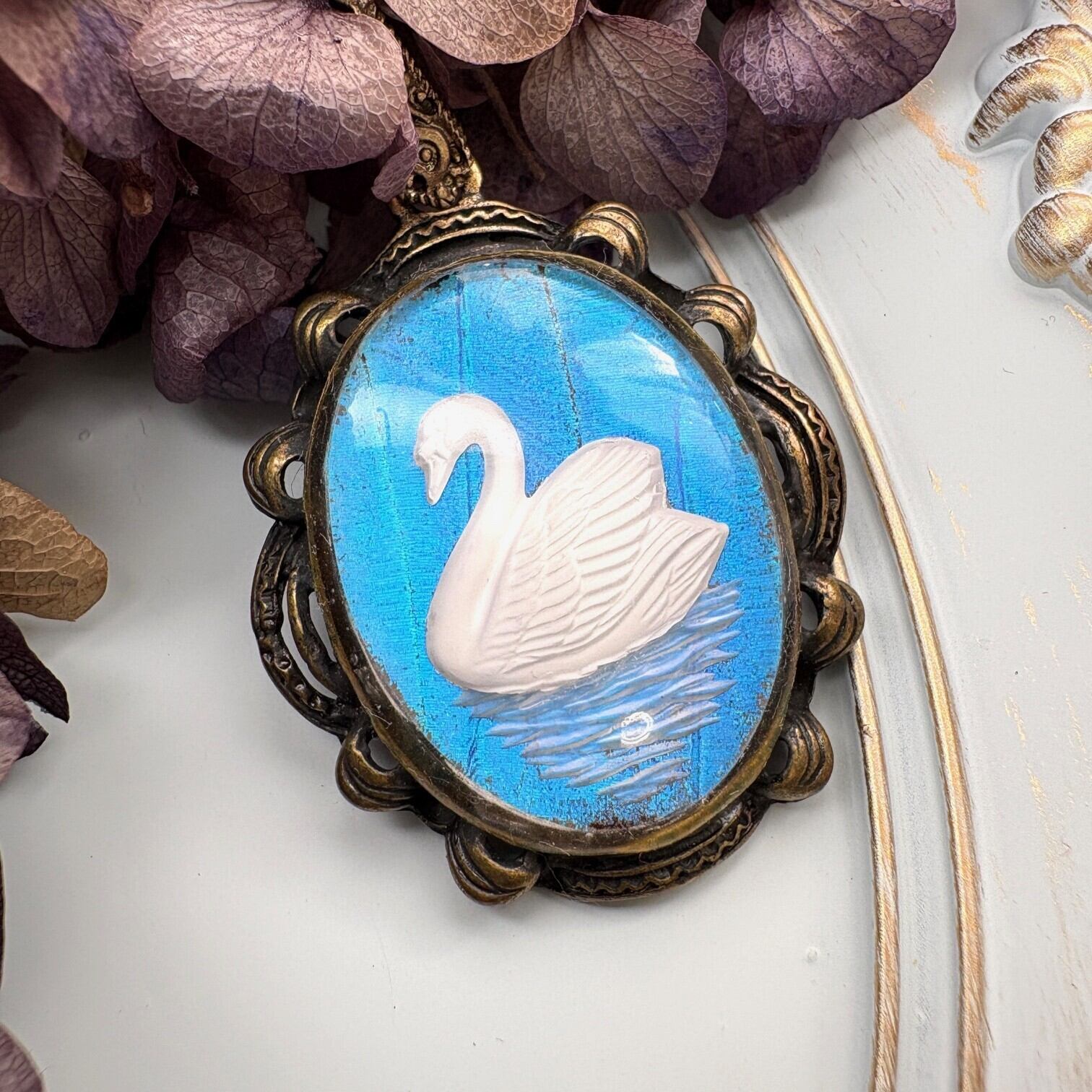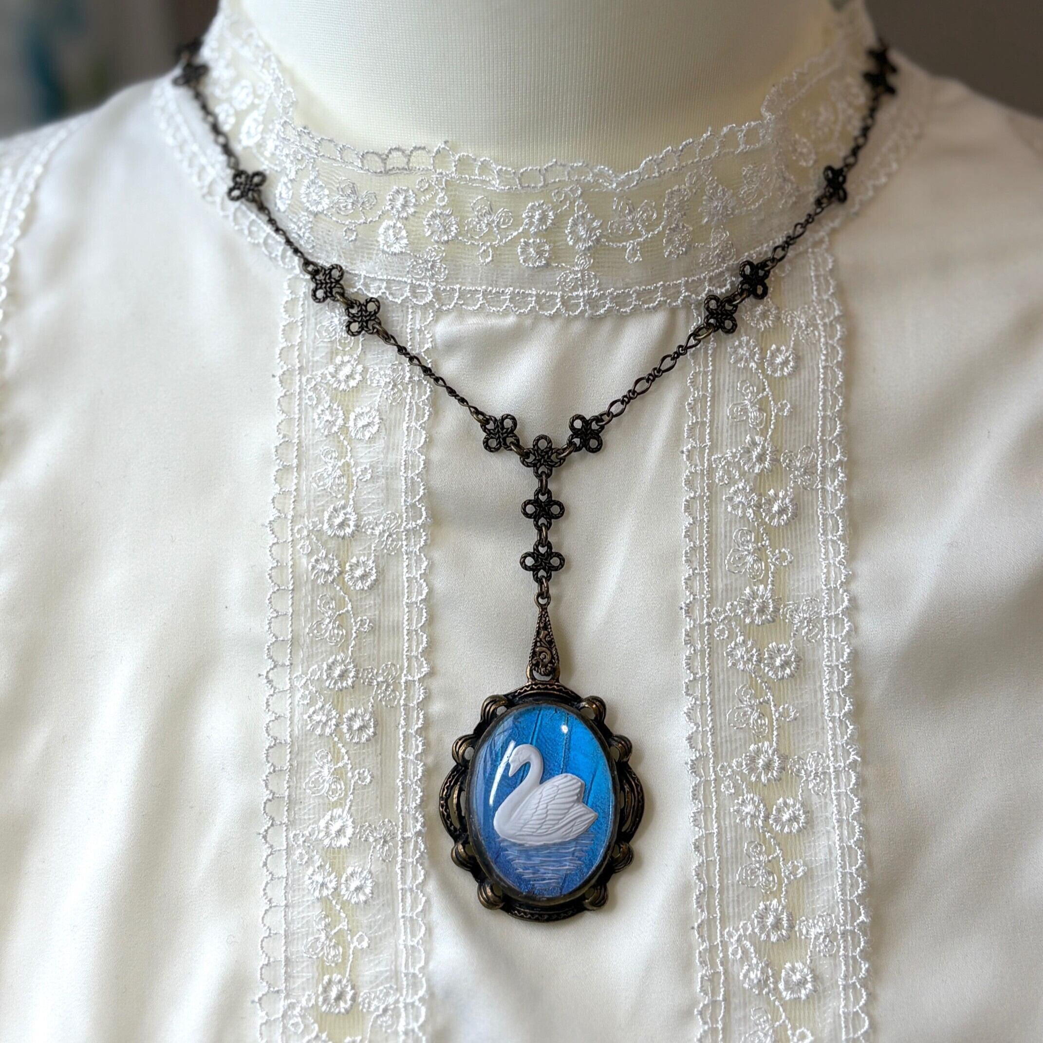 ゴダルティモルフォ蝶翅の白鳥インタリオネックレス