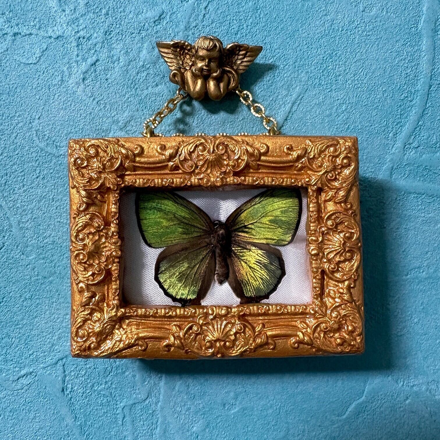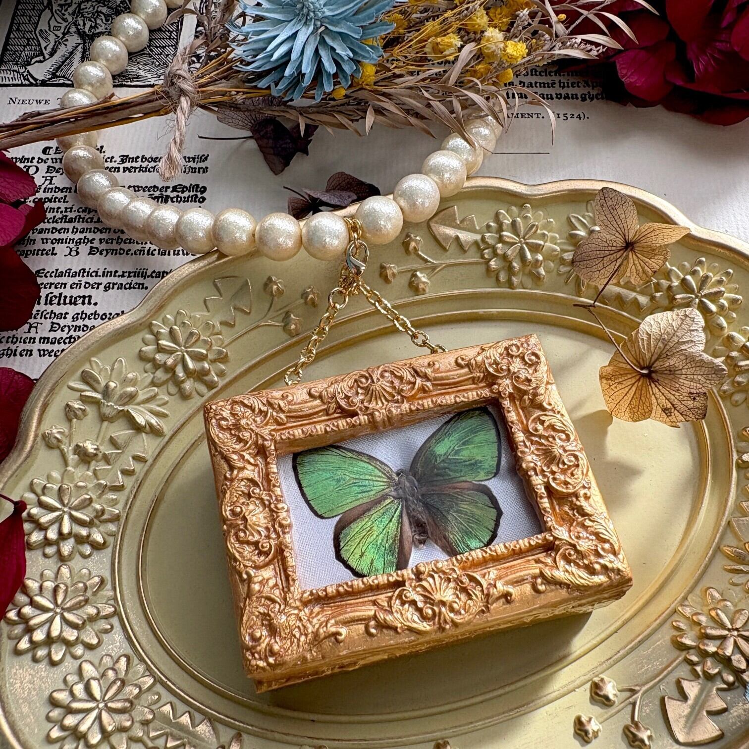 閉じ込めてある蝶はオスで美しい緑色の金属調光沢の翅をもっており、